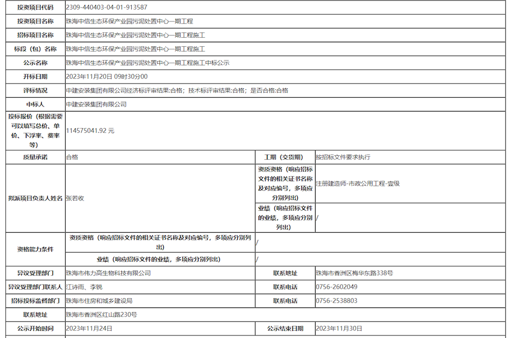 珠海中信生態環保產業園污泥處置中心一期工程施工中標公示