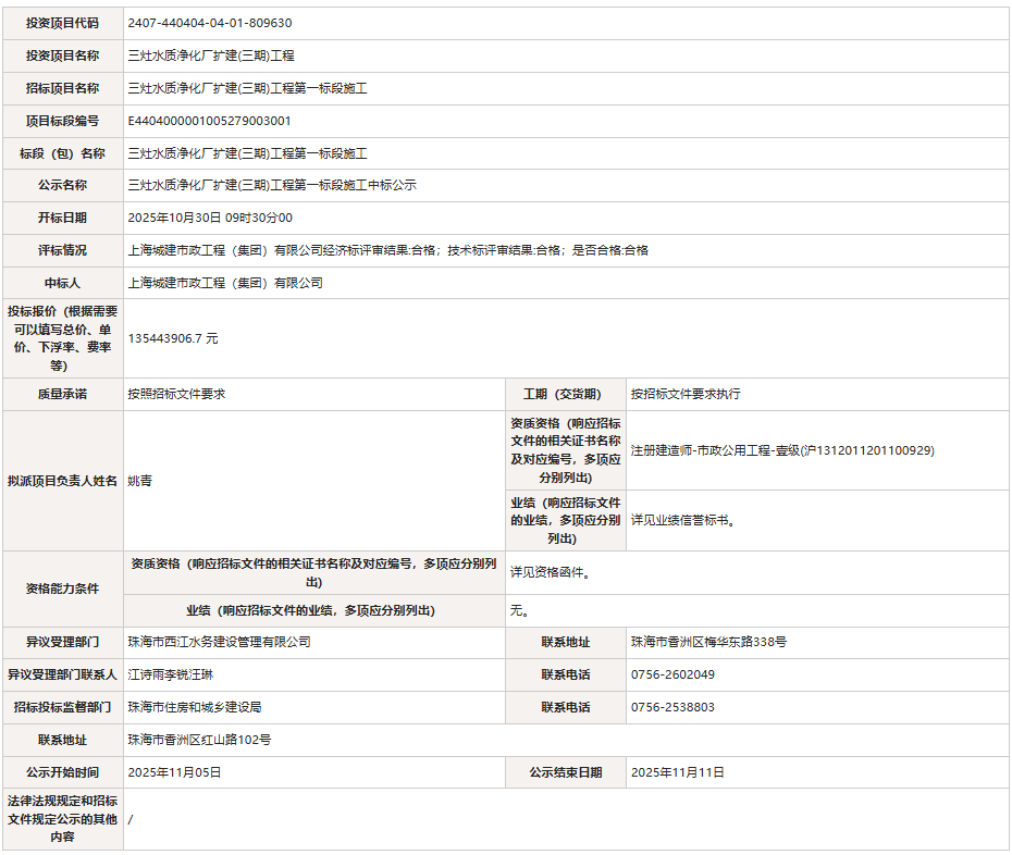 三灶水質凈化廠擴建(三期)工程第一標段施工中標公示